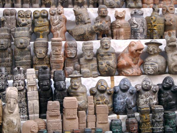 Также на многих рынках торгуют гипсовыми статуэтками индейского бога домашнего очага Экеко. Этот красноносый, усмехающийся мифологический персонаж всегда имеет при себе какие-либо миниатюрные предметы: мешки с зерном, одеяла или пачки бумажных денег. Как утверждают боливийцы, Экеко дарует людям материальное благополучие.