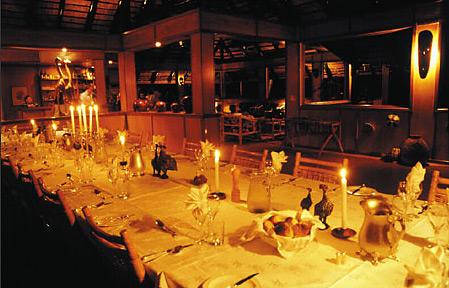 В изысканном ресторане на веранде, в тени эбеновых деревьев, сервируют лучшие блюда местной кухни. Традиционные африканские ужины готовят и подают в крытом дворе «бома» (boma) при свете большого костра. Работает бар с большим выбором экзотических коктейлей.