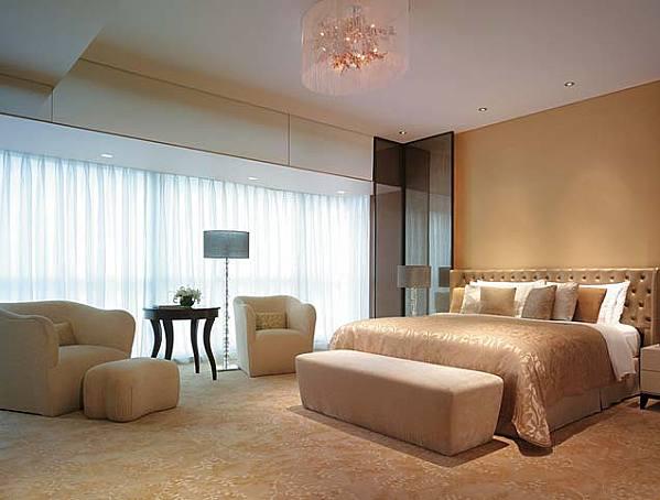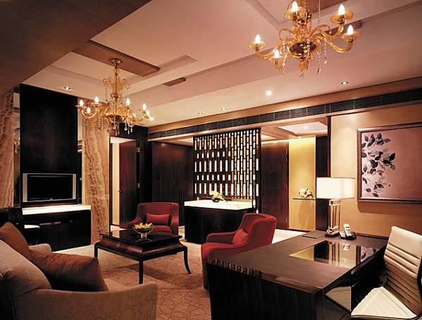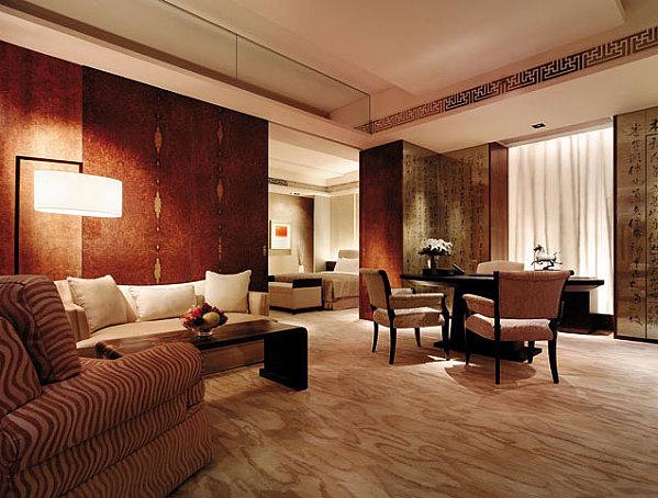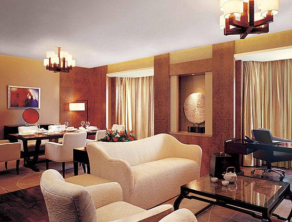 В номерах — элегантные классические интерьеры в теплых тонах, с ковровым покрытием на полах, удобной мебелью, мягким освещением, украшениями в китайском стиле, большими окнами в эркере, из которых открывается панорамный вид на парк и город.