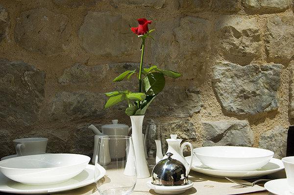 Ресторан отеля, где сервируют завтраки, сочетает стильный современный дизайн и архитектурные детали крепости 15 века.