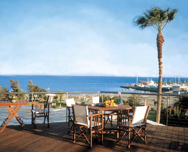 Отель расположен в пригороде, в 12 км к востоку от центра Лимассола. Выгодное расположение позволяет наслаждаться тишиной пригорода и близостью торговых и развлекательных центров Лимассола. Поездка к другим городам и достопримечательностям Кипра займет немногим более часа. Современное многоэтажное здание находится всего в нескольких шагах от пляжа, расположено на фоне невысоких гор, окружающих Лимассол. Отелю принадлежит собственная территория — 37 тысяч кв. м ухоженных, террасированных садов и пристань на 227 якорных мест. Гостей встречает прохладное, отделанное мрамором и украшенное живыми цветами и пальмами лобби с уникальным шестиэтажным атриумом. Общее впечатление элегантности и роскоши дополняют декоративные водопады и панорамные лифты. На каждом этаже стоят автоматы для приготовления льда и чистки обуви. В отеле есть 4 ресторана и 3 бара, два бассейна, теннисные корты, дайвинг-центр и Центр водных видов спорта, фитнес-центр, конференц-залы и офисные помещения для проведения деловых мероприятий.