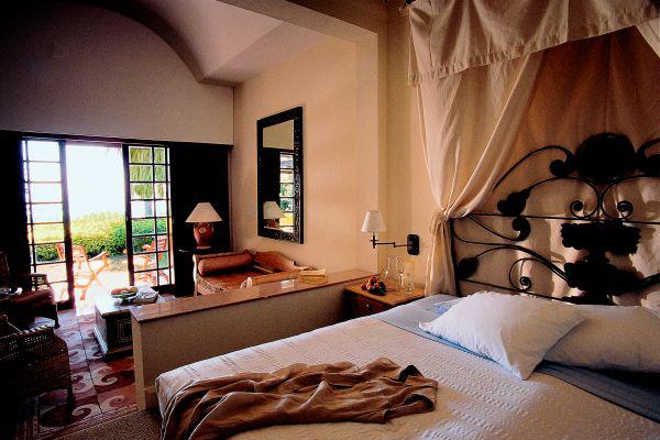 Terrace Sea View Room: 26 м2. Расположен на 1 этаже, состоит из спальни с двуспальной кроватью или двумя кроватями twin, ванной комнаты, отделанной мрамором, большой меблированной террасы с видом на бассейн и море. Максимальное размещение — 3 человека.
