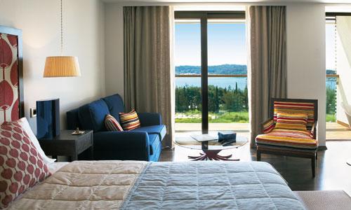 Junior Suite: 40 м2. Номер с индивидуальным дизайном, состоит из спальни с кроватью king-size и гостиной зоной, ванной комнаты с большой ванной, отделанной мрамором, выходит на Саронический залив.