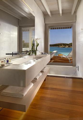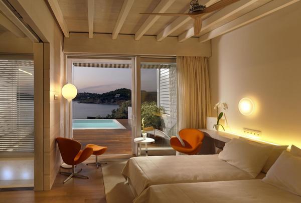 Ambassador Suite: 82 м2. Роскошный номер, расположен на 3 этаже, обставлен дизайнерской мебелью, состоит из спальни, гостиной, ванной комнаты, отделанной мрамором, с паровой кабиной и сауной, просторного балкона с видом на залив Сароникос.