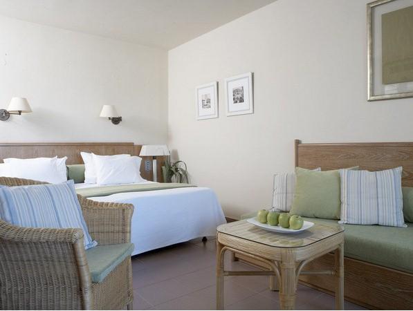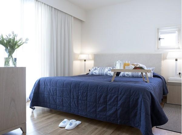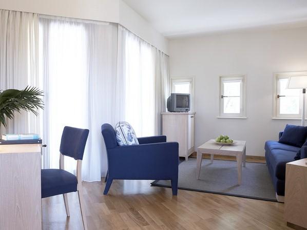Deluxe Suite: 35 м2. Изысканный номер в средиземноморском стиле, выдержанный в бело-голубых тонах, состоит из спальни с кроватью king-size или двумя кроватями twin, гостиной, ванной комнаты c ванной, балкона с видом на бассейны или сады.