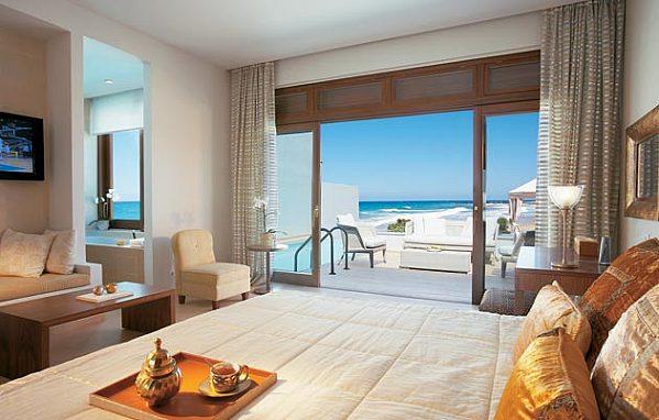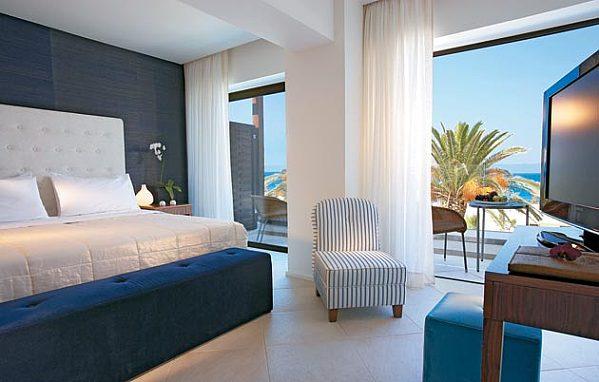 Junior Sunset Suite (side sea view): — 40 м2. Расположен в здании Sunset, прекрасно подходит для размещения с 2 детьми, состоит из спальни, гостиной зоны, которая отделяется от спальни раздвижными дверьми, гардеробной ванной комнаты, меблированного балкона (7 м2) для номеров на втором этаже или террасы (20 м2) с садом для номеров на первом этаже, выходящих на море или сад, откуда открывается живописный вид на критский закат. В номере LCD TV и спутниковые каналы. Максимальное размещение — 4 человека.
