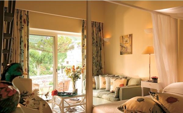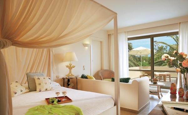 Double Room: 28 м2. Расположен в главном здании, выполнен в кремовых, золотистых и серебристых оттенках, состоит из спальни с зоной отдыха, ванной комнаты, балкона с видом на море или сад. Максимальное размещение – 3 человека.