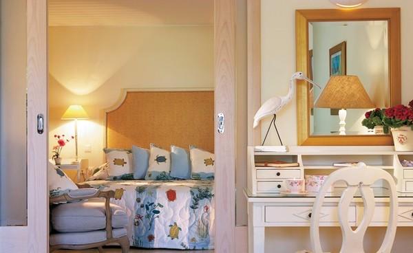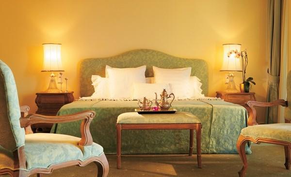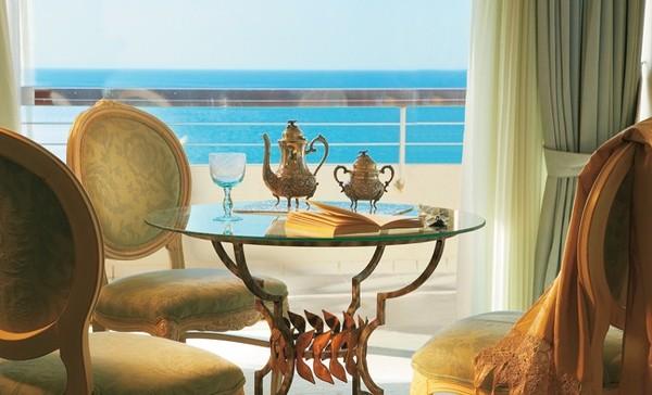 Palace Guestroom: 50 м2. Пентхаус, расположенный в главном здании, с высокими наклонными потолками, выполнен в кремовых, золотистых и серебристых оттенках, состоит из спальни с гостиной зоной, ванной комнаты, гардеробной, меблированного балкона с панорамным видом на море. Максимальное размещение – 2+1.
