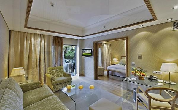 Junior Suite: 40 м2, состоит из спальни с кроватью king size и софой, гостиной, ванной комнаты, отделанной мрамором с джакузи; выходит на археологические раскопки и сад. Отличительная особенность номера – 2 телевизора, классический дизайн внутреннего убранства, изящная мебель. Максимальное размещение – 3 человека.