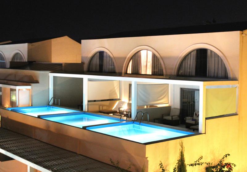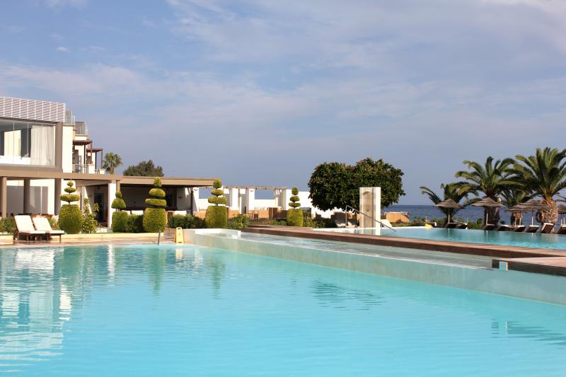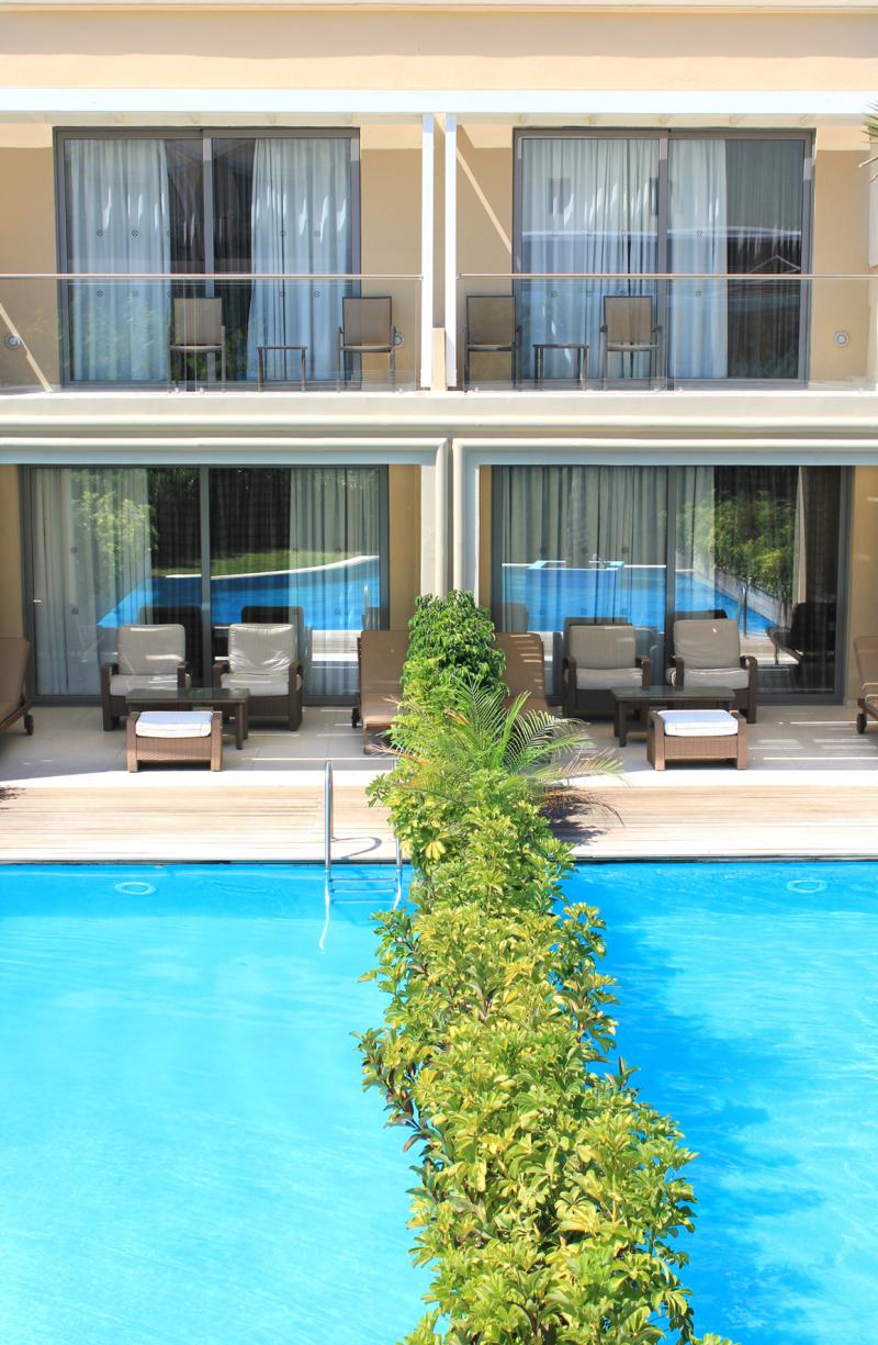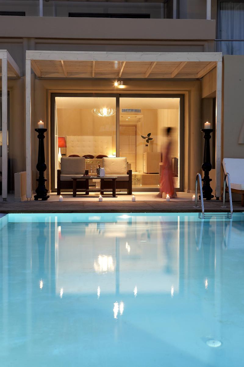 Grand Suite: расположен на первом этаже, состоит из спальни с гостиной зоной, ванной комнаты с джакузи, террасы с видом на море, имеет выход к бассейну, общему с соседними номерами. Максимальное размещение – 3 взрослых или 2 взрослых+1 ребенок.