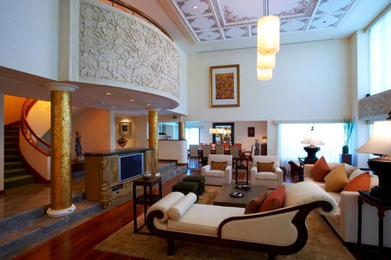 Imperial Suite: 390 м2. Роскошный двухуровневый номер, украшен предметами антиквариата и балийскими артефактами, включает гостиную с роялем, столовую, 2 спальни, ванные комнаты, балкон, просторную террасу с выходом в лагуну.