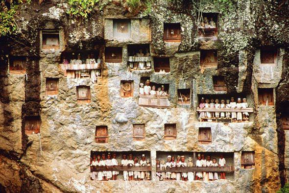 В южной части острова живут любители путешествий буги и макассары. Эти народы издревле известны как искусные кораблестроители и непревзойденные мореплаватели, контролировавшие своими пиратскими судами воды от Сулавеси до Австралии. Немного севернее живут тораджи – горные люди. Культура мегалита, уникальные анимистические верования этого народа достойны того, чтобы посетить местность Тана Тораджа. Особенно известны их погребальные традиции. Гроб с телом помещается в каменную пещеру-гробницу в скале, которая украшается фигурками, символизирующими умерших предков. А кульминацией церемонии похорон становится массовое жертвоприношение животных (до 50 буйволов), которых положено убивать одним-единственным ударом ножа.