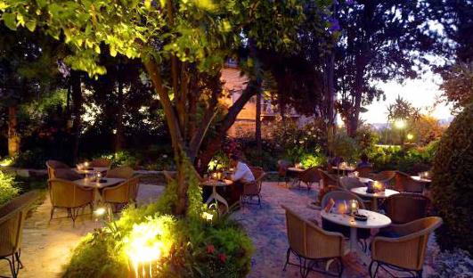 В хорошую погоду столики сервируют в живописном внутреннем дворе отеля, в окружении сада и фонтанов.