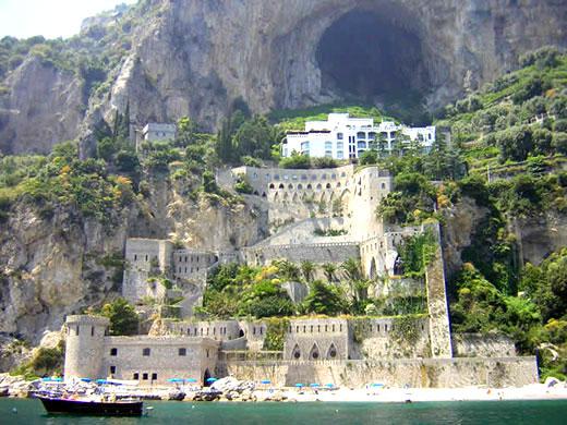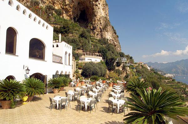 На романтическом Амальфитанском побережье в 70 км от международного аэропорта Неаполя расположен отель Grand Hotel Il Saraceno. Здание гостиницы находится в углублении скалы, которая спускается к побережью: просторные террасы, голубая лагуна бассейна, окружающие лимонные и апельсинные рощи, пышные ступенчатые сады — весь комплекс отеля, стилизованный под небольшой средневековый дворец, нависает над залитым солнцем морем, составляя неотъемлемую часть горного массива. Элегантные корпуса голубоватого цвета обращают гостей к главной теме «сарацинской» гостиницы, обыгрывающей традиционные восточные элементы: высокие окна, стрельчатые арки, узорчатые колонны, элегантные балконы и роспись на арабские сюжеты. Как внешнее убранство, так и оформление номеров, ресторана и холлов гармонично прослеживают общую концептуальную линию, приглашая гостей насладиться несколько искусственным изяществом и отточенным до мелочей великолепием этого удивительного восточного уголка южной Италии. Последнее в полной мере проявляется в дизайне номеров. Массивные кровати с живописными панно, грациозные стулья и столики, огромные окна, наполняющие комнаты светом, оригинальные светильники, трюмо и роскошные драпировки — создают праздничное настроение каждого номера, идеально сочетаясь с открывающимися прекрасными видами на зелень окружающих садов и бесконечную синеву Средиземного моря. Исторический облик гостиницы дополняет старинная часовня, в которой устраиваются венчания. Также в комплекс отеля входят ресторан, собственный пляж и открытый бассейн.