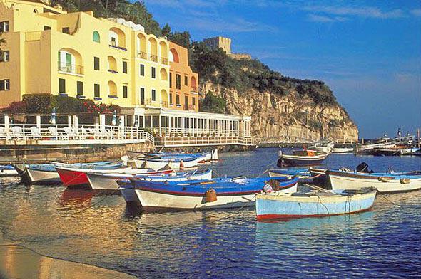 Искья — самый большой из островов Неаполитанского залива. Его самая высокая точка — гора Эпомео (788 м) — дремлющий много веков вулкан. Почва вулканического происхождения очень плодородна — поэтому так вкусны и душисты местные фрукты и овощи. На Искье вы встретите каштаны по соседству с бананами, цикламены рядом с кустиками черники, буйно цветущие и плодоносящие кактусы и белые грибы. Живописнейшая горная дорога связывает крохотные городки и рыбачьи поселки — Искья, Казамиччиола, Лакко Амено, Форио, Барано и Серрара Фонтана. Каждый из этих городков уникален по-своему. Искья-Порто — столица острова, где на центральной улице в туристический сезон не смолкает веселье всю ночь. Лакко Амено — маленький и чопорный городок, утопающий в зелени. Пейзажи меняются каждую минуту: на смену суровым скалам приходят небольшие песчаные пляжи, на смену причудливому силуэту старинной церкви — оливковые и лимонные рощи. Мягкий климат (среднегодовая температура + 17 ºС), чистейшее море, дарящее любителям подводного плавания радость встречи с зарослями черного коралла, мириадами рыб и стайками дельфинов; целебные термальные источники; прекрасно оборудованные отели — все здесь послужит Вашему здоровью и настроению.