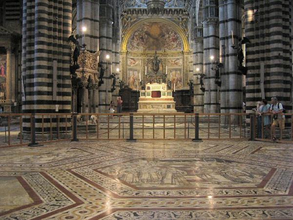 Основной достопримечательностью города является архитектурный ансамбль площади Кампо (Piazza del Campo). Ее форма, напоминающая перевернутую раковину, считается одной из красивейших во всей Италии. На площадь смотрят дворец Санседони и дворец Публико (Palazzo Pubblico), в котором размещается экспозиция музея Чивико (Museo Civico) c великолепными фресками Симоне Мартини. Архитектурным шедевром XII века является Главный собор (Duomo) c великолепным романским фасадом. Однако главная его особенность внутри — это единственный в мире, неповторимый пол из мраморных плит с изображенными на них изумительными по красоте сценами. Примечательны также кафедра с рельефами на библейские сюжеты работы Андреа Пизано. А находящиеся в соборе статуи Святого Петра и Святого Павла были созданы молодым Микеланджело. Дворец украшает 102-метровая башня дель Манджа (torre del Mangia) XIV века. В верхней части площади расположен фонтан Радости (fonte Gaia).