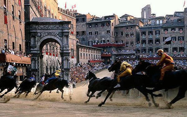 Два раза в год, 2 июля и 16 августа, на главной площади Кампо происходит Палио — соревнования наездников из разных контрад города. Так же называется флаг, который достается победителю. Лошадь — главный участник праздника. Несколько дней до скачек ее круглосуточно охраняют 12 мужчин. Лошадь, финишировавшая первой, даже без всадника, считается победителем. Хотя этот праздник длится всего лишь 2 дня жители Сиены готовятся к нему загодя, шьют себе средневековые костюмы и прогуливаются в облике рыцарей или в праздничных одеяниях XV века по улицам города практически все лето.