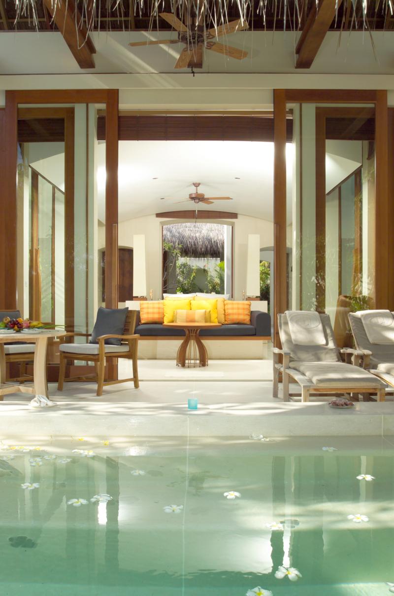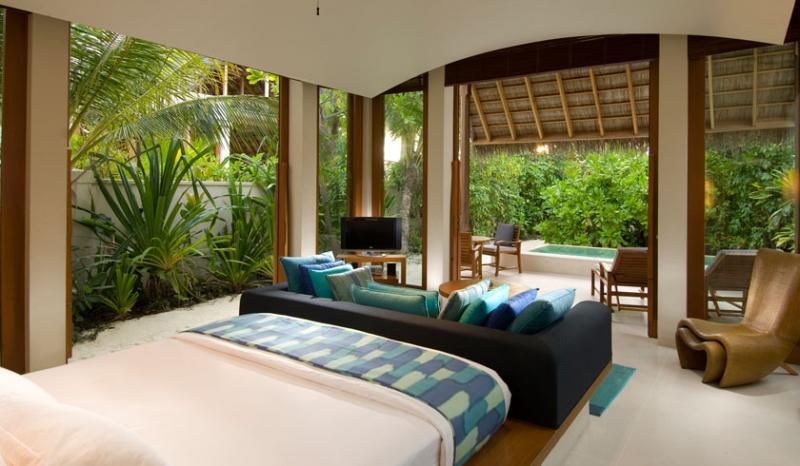 Beach Villa: (до 150 кв.м с террасой) — расположена на берегу, состоит из спальни, ванной комнаты открытого плана, террасы с зоной отдыха, садом и душем на открытом воздухе.