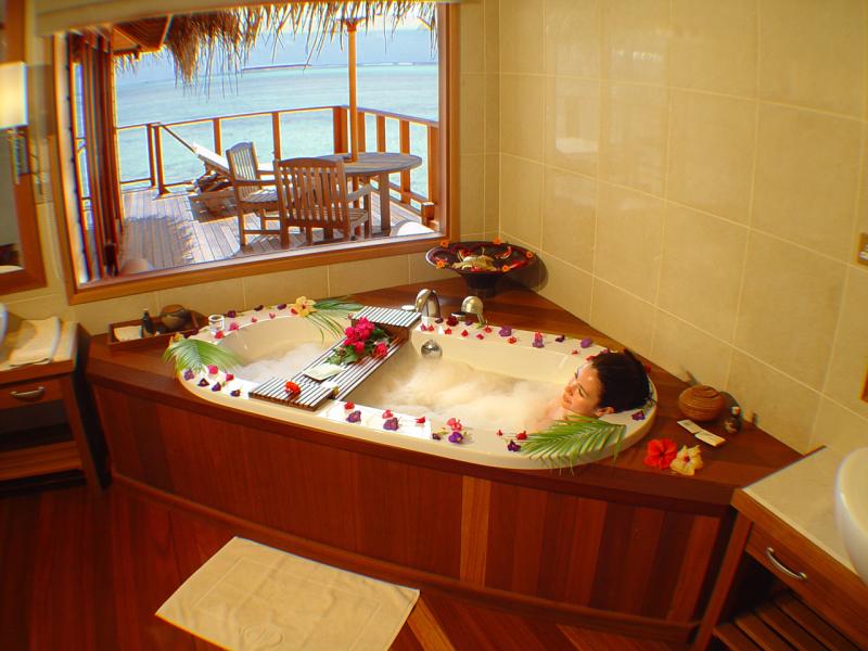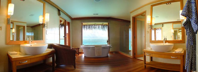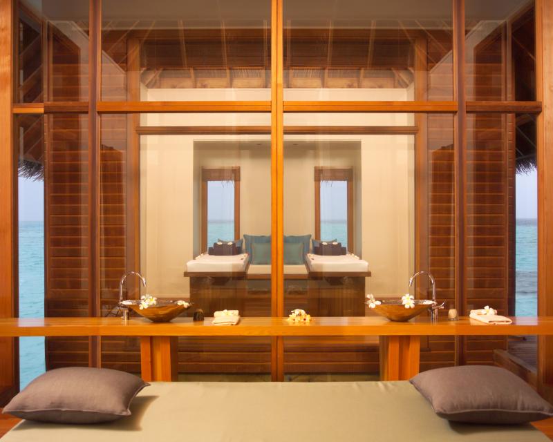 Spa Water Villa: (до 500 кв.м) — расположена на сваях над водой лагуны, состоит из спальни с гостиной зоной, гардеробной, комнаты для СПА процедур, ванной комнаты открытого плана, террасы с зоной отдыха и спуском в воду. Максимальное размещение - 3 взрослых.