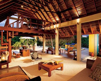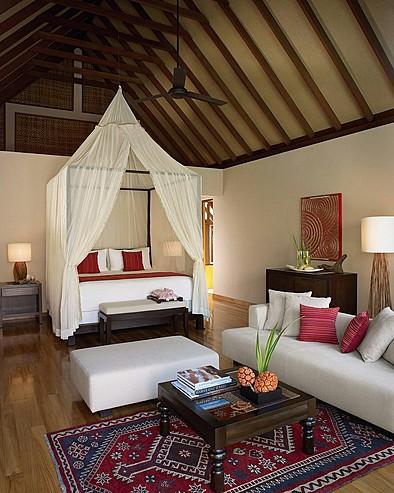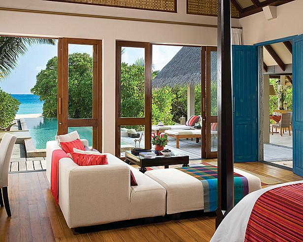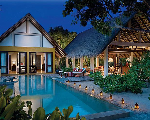 Two-bedroom Royal Beach Villa: 310 м2. Расположена на западе острова, с панорамным видом на лагуну, состоит из павильона с гостиной и обеденной зонами, 2 спален (в одной - кровать king-size, в другой - 2 кровати twin), 2 ванных комнат, гостевой туалетной комнаты, кухни, комнаты для прислуги с душевой, внутреннего дворика с массажными столами, террасы (890 м2) с 30-метровым бассейном и столовой зоной над ним, 2 душами на открытом воздухе, павильоном bale для отдыха. Максимальное размещение - 6 человек.