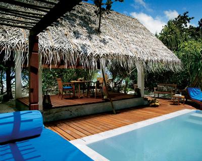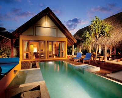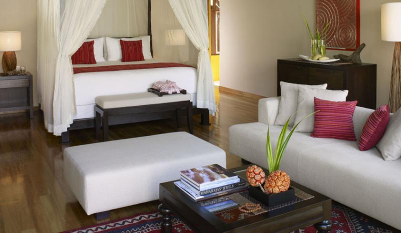 Beach Bungalow with Pool: 75 м2. Расположен на севере острова, выходит на сад и лагуну, включает спальню с гостиной зоной, ванную комнату, террасу (91 м2) с бассейном, открытым душем, bale - павильоном для отдыха. Максимальное размещение - 2 взрослых + 2 ребенка или 3 взрослых + 1 ребенок.