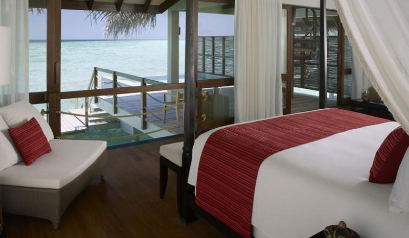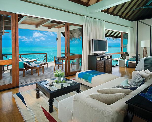 Two-bedroom Water Suite: 182 м2. Расположен на северо-западе острова, в конце пристани, с видом на закат (Sunset) или рассвет (Sunrise), состоит из гостиной с обеденной зоной, 2 спален (в одной из них - кровать king-size, в другой - две кровати twin) с ванными комнатами, террасы (200 м2) с 15-метровым бассейном, 3 душами на открытом воздухе, зоной отдыха и спуском в воду. Максимальное размещение - 4 взрослых + 2 ребенка.