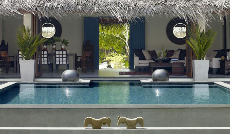 Beach Villa with Pool: 137 м2. Расположена в южной части острова на пляже, выходит на пляж и лагуну, состоит из павильона-спальни, открытой гостиной и обеденной зоны, ванной комнаты, террасы (260 м2) с садом, 12-метровым бассейном, bale - павильоном для отдыха, обеденной зоной и открытым душем. Максимальное размещение - 2 взрослых + 2 ребенка или 3 взрослых + 1 ребенок.