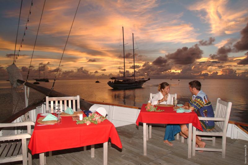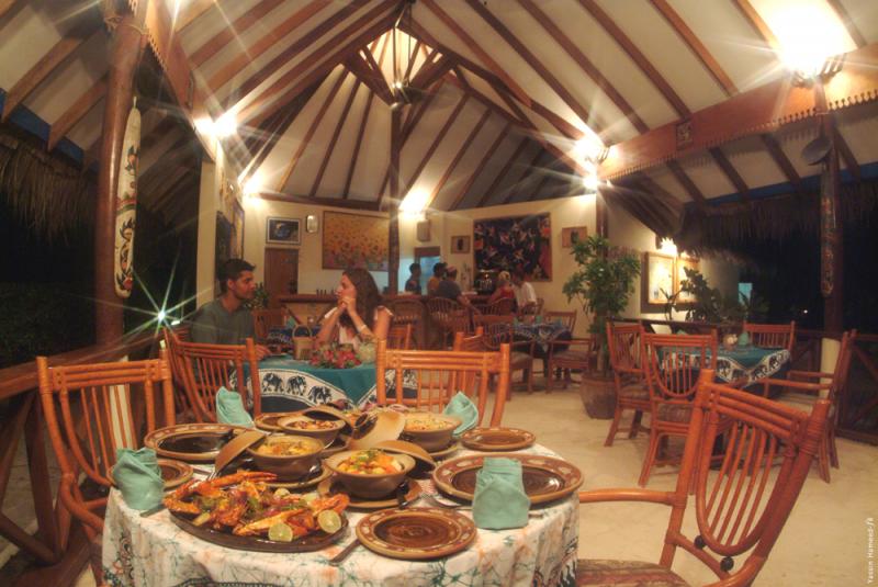 Ресторан The Farivalhu Restaurant — блюда европейской кухни.Ресторан Maalan Restaurant — блюда мальдивской, европейской, азиатской кухни.