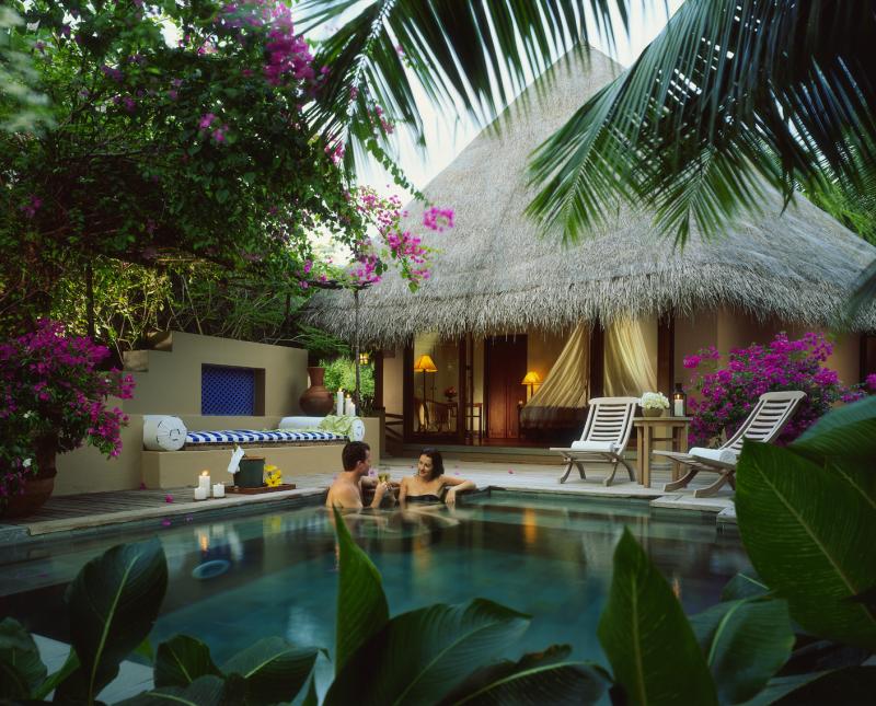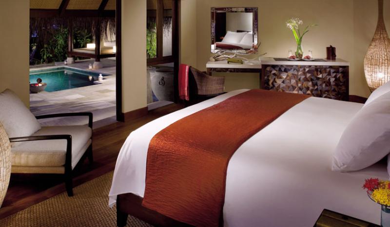 Sunset Beach Bungalow with Pool: 63 м2. Расположен на берегу, c западной стороны острова, с видом на океан и закат, состоит из спальни, гардеробной, ванной комнаты, террасы с садом, бассейном, душем на открытом воздухе, обеденной зоной и павильоном для отдыха. Максимальное размещение - 2 взрослых + 2 ребенка или 3 взрослых + 1 ребенок.
