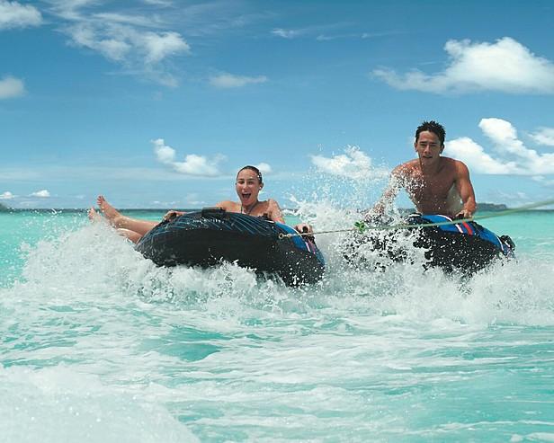Sunrise One-Bedroom Water Suite: 91 м2. Расположен на сваях над водой, с восточной стороны, с видом на восход, состоит из спальни, гостиной, гардеробной, ванной комнаты, гостевой туалетной комнаты, 2 террас (общей площадью 55 м2) с зоной отдыха, душем на открытом воздухе и спуском в воду. Максимальное размещение - 2 взрослых + 2 ребенка или 3 взрослых + 1 ребенок.