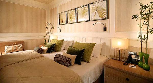 Standard Double Land View: 36-38 м2. Выполнен в бежево-золотистых тонах, состоит из спальни, ванной комнаты, отделанной венецианской мозаичной плиткой — в некоторых номерах с ванной и отдельным душем, выходит на ландшафты курорта.