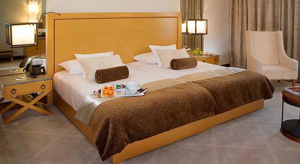 Executive Double Land View: 40-46 м2. Выполнен в бежево-золотистых тонах, состоит из спальни с зоной отдыха, ванной комнаты, отделанной венецианской мозаичной плиткой — в некоторых номерах с ванной и отдельным душем, выходит на ландшафты курорта.