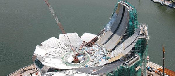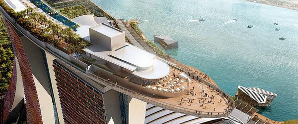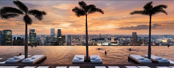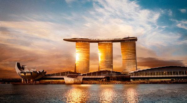 В центре Сингапура, над сверкающей морской гладью возвышается Marina Bay Sands Сингапур — грандиозное сооружение из трех 55-этажных небоскребов, увенчанных гигантским океанским лайнером площадью 12400 м2 с фантастическим парком Sands SkyPark. Это архитектурное футуристическое чудо, спроектированное известным архитектором Моше Сафди и открытое в 2010 году, впечатляет невиданным размахом во всех отношениях. Здесь есть всё для отдыха, развлечений и бизнеса. Фешенебельный отель с более, чем 2500 роскошными номерами и сьютами, из панорамных окон которых открываются красивейшие ландшафты Сингапура и зеркальной морской глади. Более 60 ресторанов и баров, где, под руководством известных шеф-поваров из разных стран, готовятся изысканные блюда всех кухонь мира. Уникальный, словно сливающийся с небом огромный 150-метровый бассейн на высоте 200 м, прекрасный СПА центр и детский клуб для разных возрастов. Шикарное казино мирового класса, два театра, галерея с 300 бутиками модных брендов, великолепный музей в форме лотоса, галерея современного искусства, живописные сады, конгресс-центр, вмещающий до 45000 гостей, обширные выставочные площади, и даже водный канал, по которому можно прокатиться на старинной китайской лодке сампана.