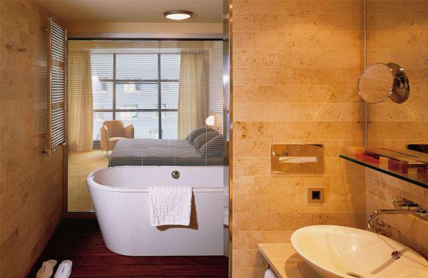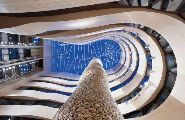 Здание "Gran Hotel Domine Bilbao" расположено напротив музея Гуггенхайма в Бильбао чье отраженье можно видеть в многочисленных гранях зеркального фасада отеля и, вне всякого сомнения, несет на себе отпечаток подобного соседства. "Grand Hotel Domine", первый пятизвездочный отель испанской гостиничной сети Silken. Открываешь его дверь - и попадаешь в особый, фантастический мир. Оригинальные стилевые решения в области архитектуры и дизайна, олицетворяющие различные культурные тенденции XX века, были воплощены в этом отеле по задумке дизайнера Хавьера Марискаля и архитектора Фернандо Саласа. Все без исключения детали здесь гармонируют друг с другом: темное дерево и каменные стены, мебель и посуда — все это было создано по специальному заказу Марискаля и Саласа, и в интерьере каждого номера отеля отражается художественный почерк его создателей. По их прихоти, внутреннее помещение гостиницы будто бы «распадается» на обособленные фрагменты, у каждого из которых своя цветовая гамма, а значит свое настроение, собственная индивидуальность. Интерьер кафе Metropol - отсылка к 1920-м годам и стилю школы Bauhaus. Здесь царят черный и белый цвета и стоит мебель Ле Корбюзье и Миса ван дер Роэ. В баре "Splash&Crash" атмосфера меняется - это уже 60-е с табуретами Knoll, креслами от Рона Арада и рассеянным светом.Подобная «фрагментарность», однако, не нарушает внутреннюю гармонию отеля, его целостность и органичность. Ресторан, кафе, бар, библиотека, терраса, внутренний дворик с грандиозным «каменным кипарисом», скульптурой из гальки и металлической сетки, весящей 90 тонн и достигающей в высоту 26 метров — все эти столь непохожие друг на друга зоны, образуют причудливое единство, сочетаясь и играя красками в целостном постмодернистском ансамбле.