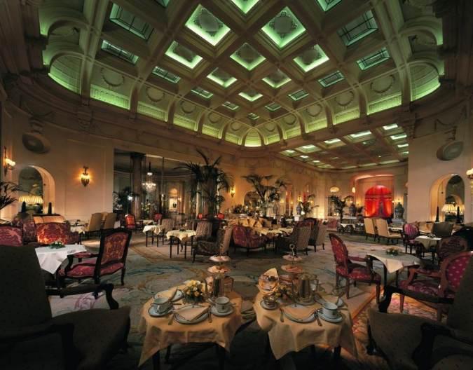 Традиционный послеобеденный чай сервируется в лобби отеля. Здесь все располагает к неторопливому чаепитию: скульптуры, выполненные в классическом стиле, оригинальная лепнина, мраморные колонны и мебель в стиле эпохи Louis XIV. Под аккомпанемент живой музыки сервируется столики, и подаются легкие закуски: аппетитные сэндвичи (сыр, салат, лосось), сладкие булочки, теплые домашние лепешки, фруктовые торты, французская выпечка, мармелад, масло и взбитые сливки и, безусловно, изысканные сорта чая.