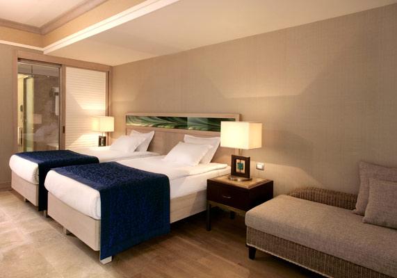 Family Suite with 2 Bedrooms: 77-87 м2. Состоит из гостиной, 2 спален (одна – с двуспальной кроватью и зоной отдыха с диваном, другая – с двумя кроватями twin), 2 ванных комнат (одна – с душем, другая – с ванной), террасы с боковым видом на море или видом на гольф-поле или на бассейн, некоторые номера имеют выход к бассейну, часть номеров - двухуровневые. Максимальное размещение – 4 взрослых+1 ребенок.