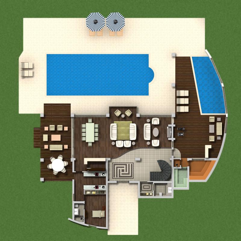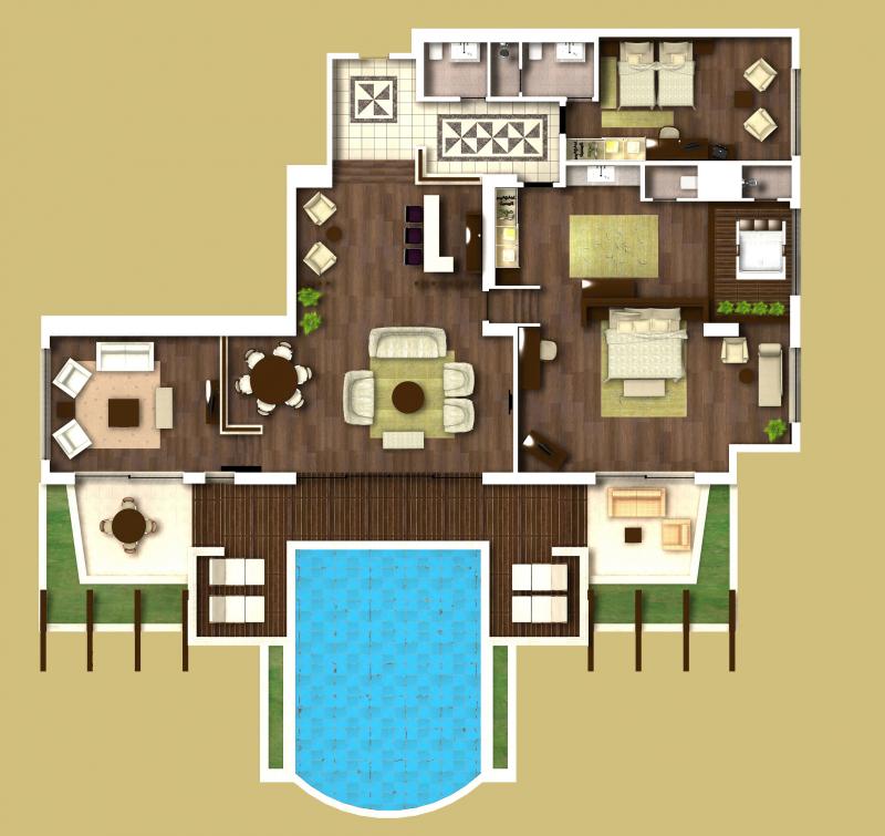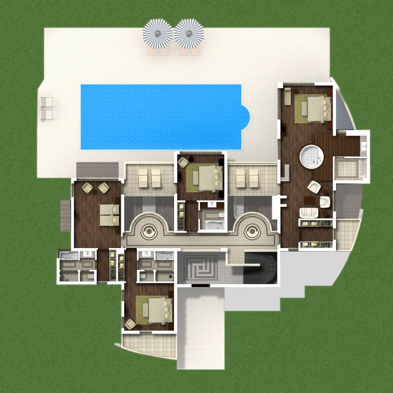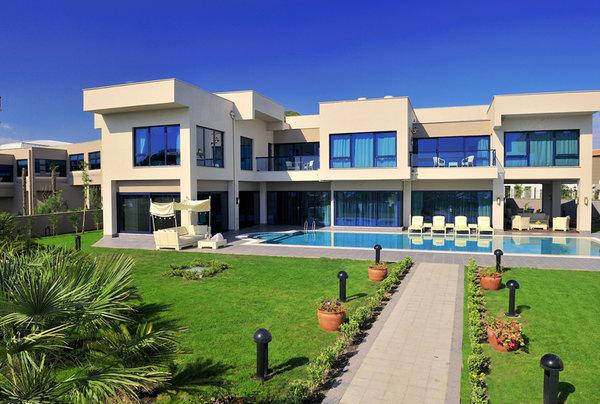 VIP Villa: 750 м2. Фешенебельные отдельно стоящие двухэтажные виллы, окруженные садом с собственным бассейном (90 м2) и террасой для отдыха. На 1 этаже находится: гостиная, столовая, бар, закрытый бассейн (29 м2), тренажерный зал, сауна, парная, кухня, комната для обслуживающего персонала, на 2 этаже — 4 спальни с ванными комнатами (одна спальня — с джакузи) и балконами.