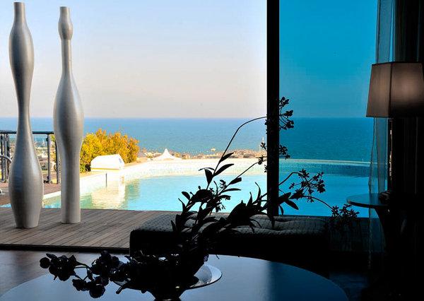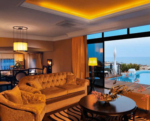 Royal Suite: 206 м2. Шикарный номер с панорамным видом на море, расположен в главном корпусе; состоит из гостиной, 2 спален, 2 ванных комнат с джакузи, просторной террасы (60 м2) с бассейном (20 м2), сливающимся с линией морского горизонта.