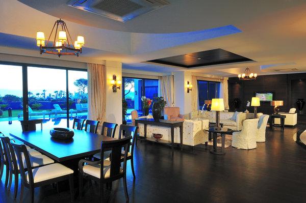 King Suite: 420 м2. Роскошный номер, расположенный на верхнем этаже главного здания, включает просторную гостиную с двумя зонами отдыха, обеденной зоной и американским баром, 2 спальни (одна-для детей) с ванным комнатами (одна — с джакузи), парную, огромную террасу (100 м2) с бассейном (40 м2) и панорамным видом на море.