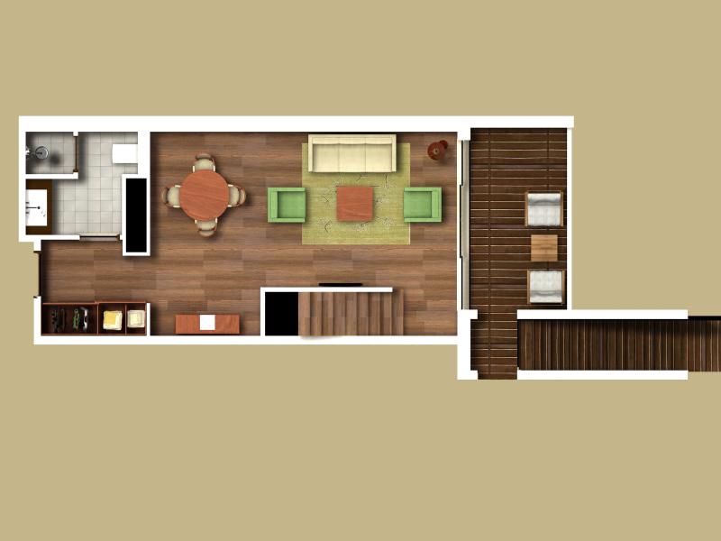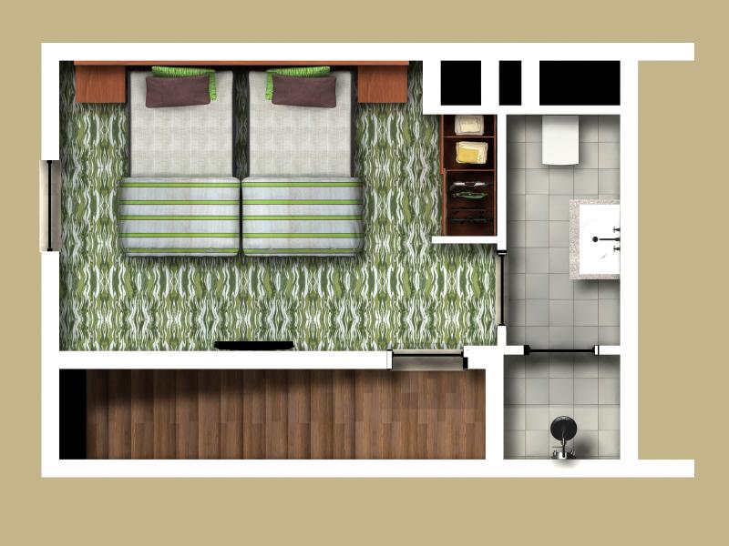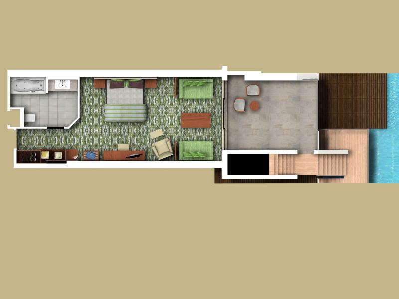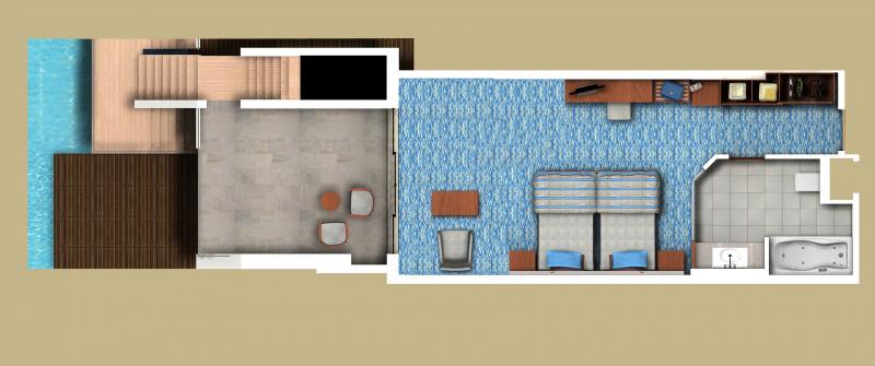 Terrace Standard Deluxe Room: 50 м2. Расположен на 3 этаже корпуса Terrace Building и имеет собственный выход к бассейну, состоит из спальни с зоной отдыха, ванной комнаты, террасы. Максимальное размещение — 3 человека.