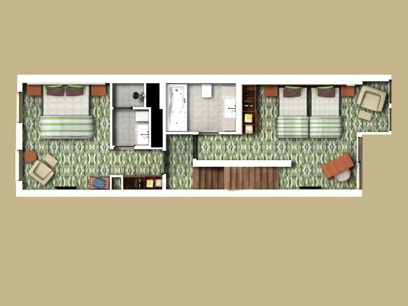 Terrace Family Room: 63 м2. Расположен на 1 и 2 этажах корпуса Terrace Building, состоит из спальни, отделенной перегородкой зоны отдыха с 2 диванами, ванной комнаты, террасы. Номера на 1 этаже выходят в сад, на 2 этаже — на бассейн и имеют выход к нему. Максимальное размещение — 4 человека.