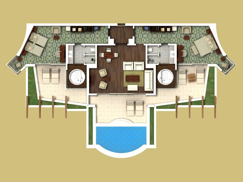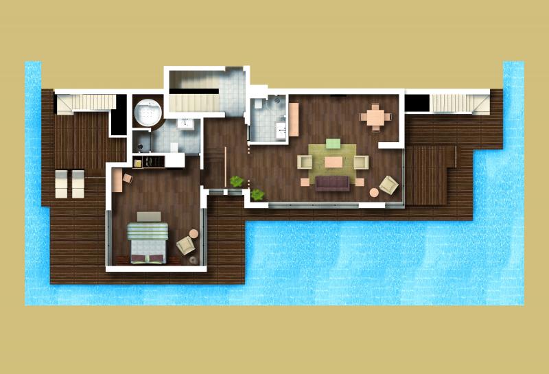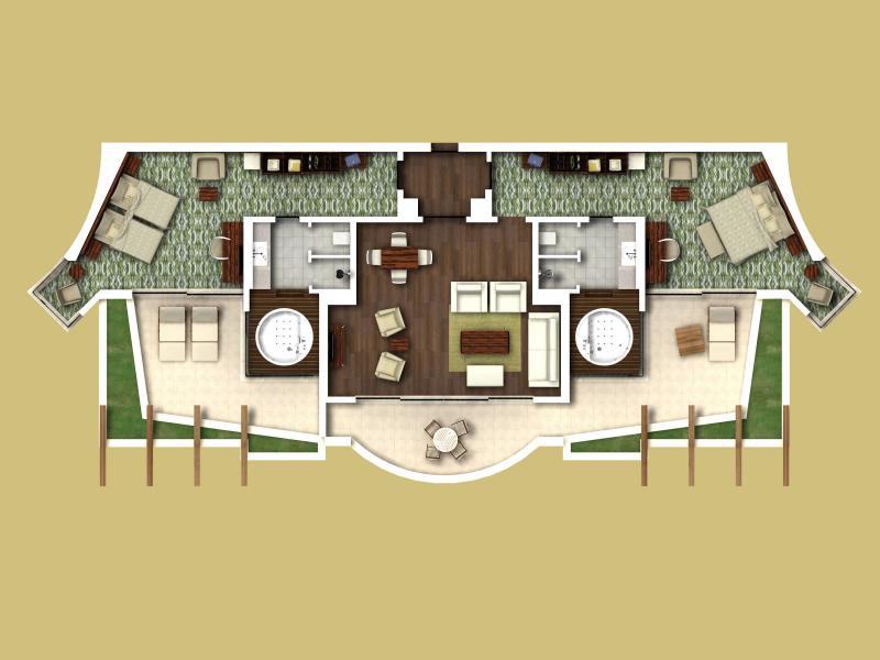 Lake Suite: 80 м2. Расположен в двухэтажных коттеджах, окруженных бассейном, в каждом — по 4 номера. Состоит из спальни, гостиной, ванной комнаты с джакузи, террасы с выходом к бассейну.