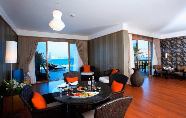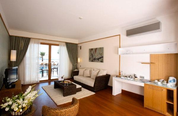 В отеле 328 номеров различных категорий, включая 150 Standard Rooms, 120 Family Rooms, 12 Deluxe Rooms, 26 Junior Suites и 16 Suites.Номера выполнены в элегантном современном стиле и декорированы с оригинальным вкусом, с балконов открывается изумительный вид на сверкающую гладь моря и живописный залив Акйарлар.