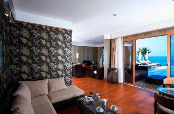 Suite: 48-79 м2. Состоит из спальни с двуспальной кроватью, соединенной коридором отдельной гостиной с диваном, который может служить дополнительным спальным местом, ванной комнаты, большого балкона. Дополнительно в номере – 2 телевизора. Максимальное размещение – 4 взрослых или 3 взрослых + 1 ребенок, либо 2 взрослых + 2 ребенка.