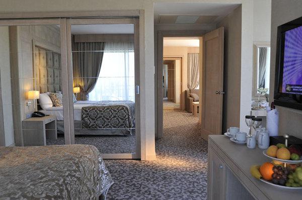 King Suite: 260 м2. Состоит из 3 спален с ванными комнатами (с джакузи), гостиной, мини-кухни, гардеробной, балкона. Дополнительно в номере — DVD player. Максимальное размещение — 6 человек.
