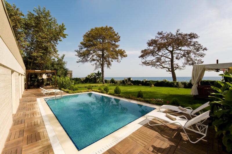 California Villa: 1100 м2. Роскошная вилла, расположена на пляже, включает холл, гостиную, столовую, оборудованную кухню, кабинет, 6 спален с ванными комнатами, джакузи, фитнес-зал, сауну, хаммам, террасу с собственным садом, бассейном, имеет выход к собственному пляжу. Дополнительно в номере — DVD player. Максимальное размещение — 14 человек.