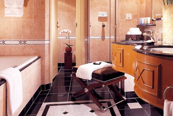 В отделанной мрамором ванной комнате ванна и гидромассажный душ.